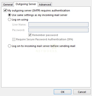 Select the check box [v] My outgoing server (SMTP) requires authentication
