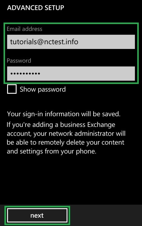 3. Choose advanced setup section, enter your Email address and Password and tap next:
